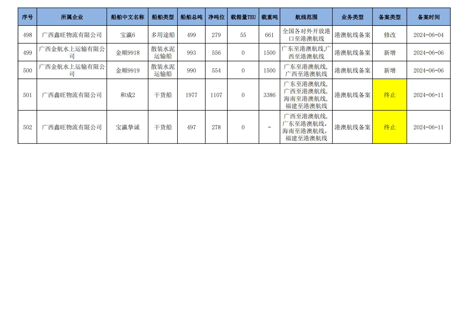 截至2024年6月11日在交通运输部水路运输建设综合管理信息系统完成备案的港澳航线水路运输船舶