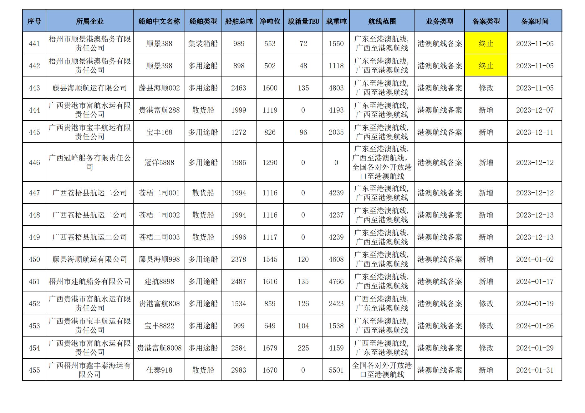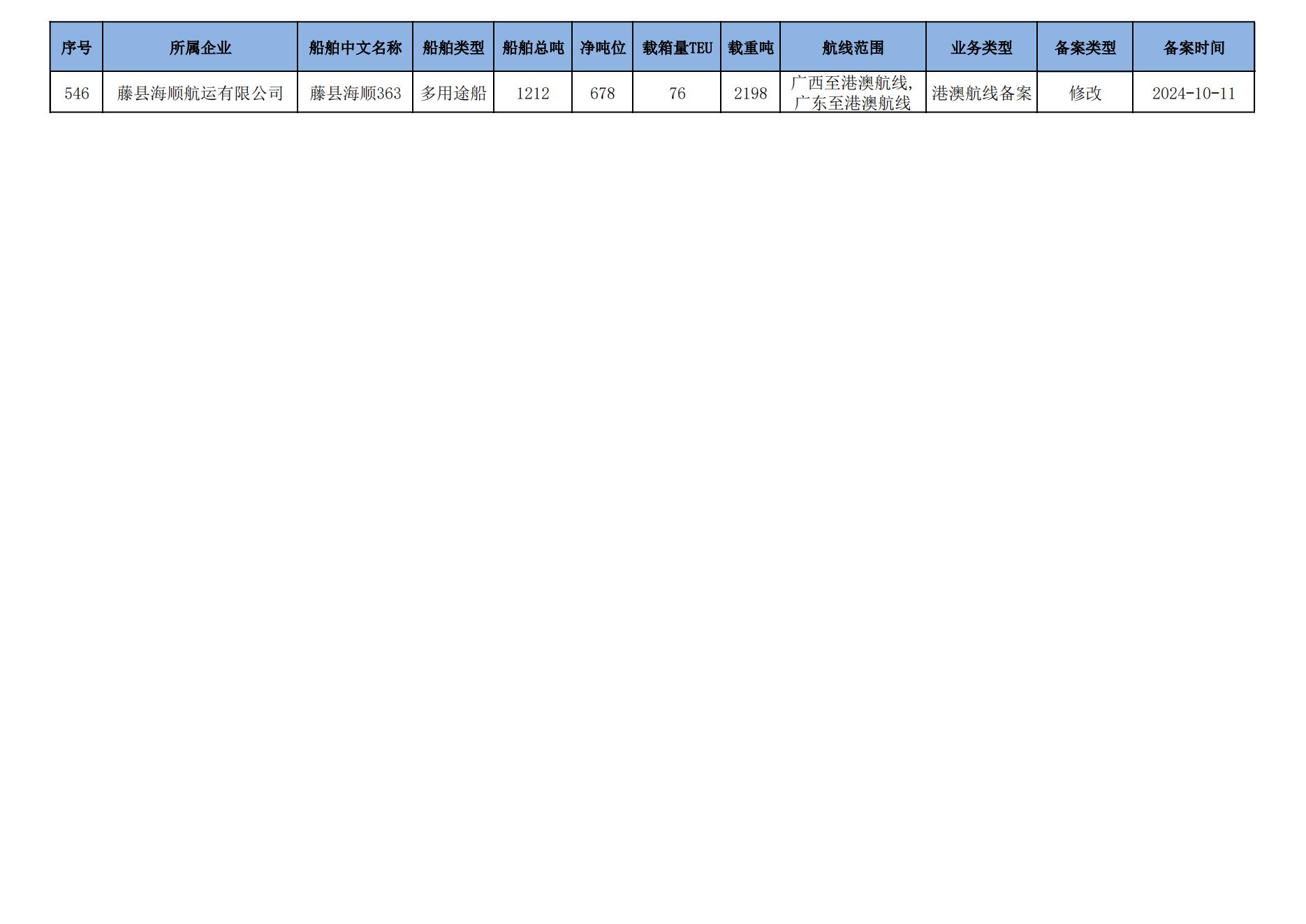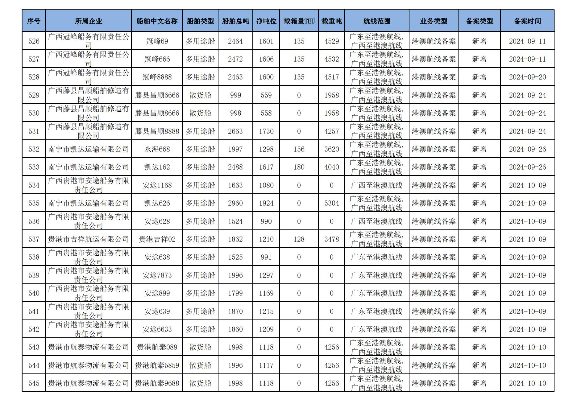 截至2024年10月11日在交通运输部水路运输建设综合管理信息系统完成备案的港澳航线水路运输船舶