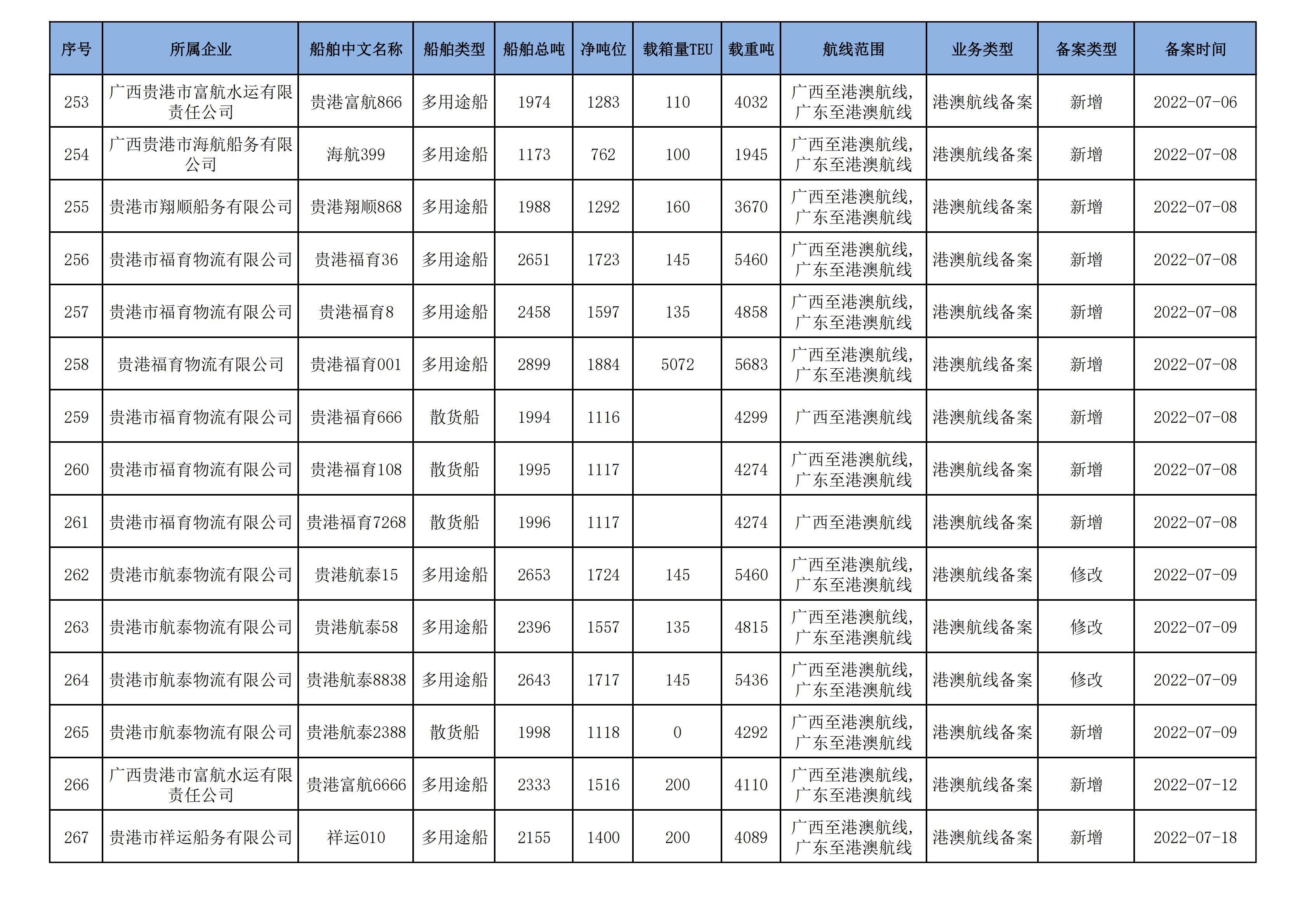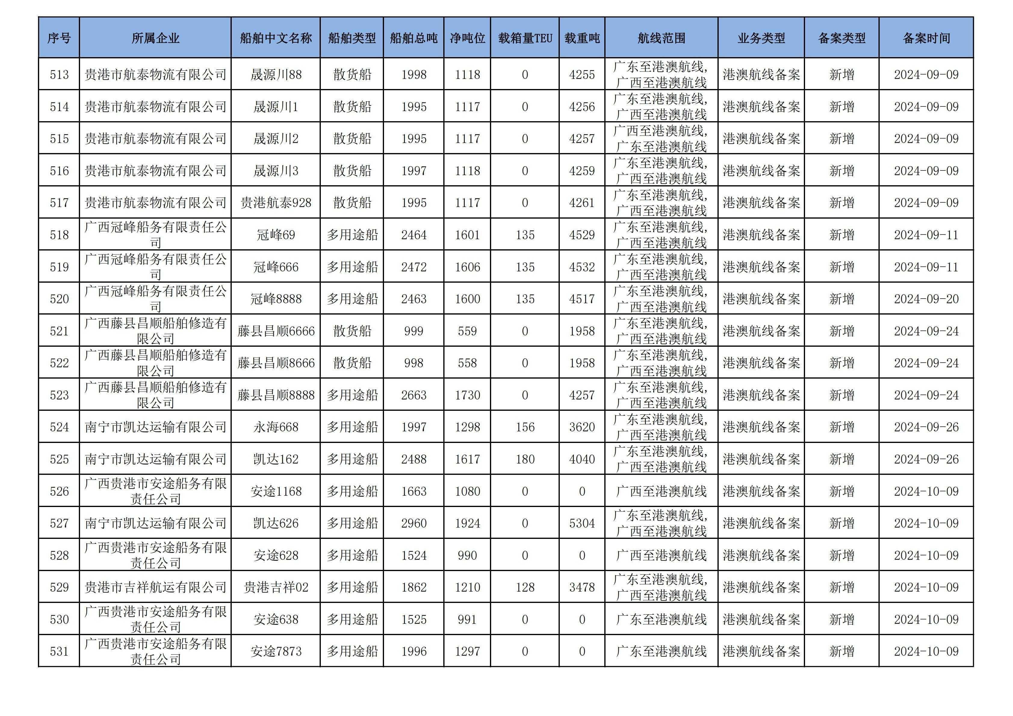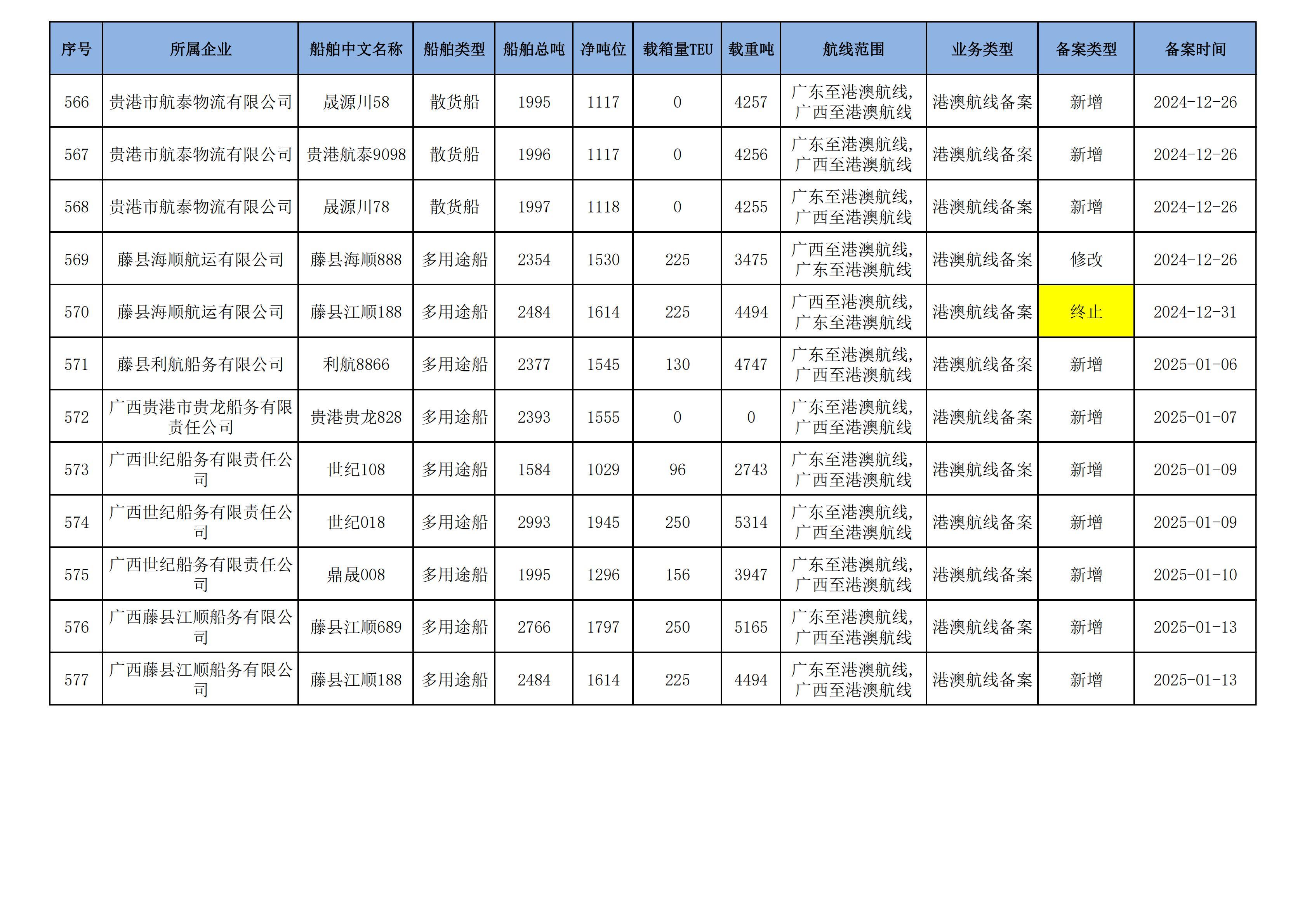 截至2025年1月13日在交通运输部水路运输建设综合管理信息系统完成备案的港澳航线水路运输船舶