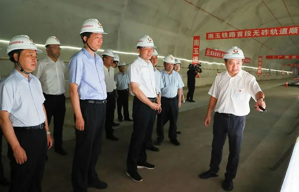 孙大伟一行来到广西市市通高铁工程重大项目——新建南宁至玉林铁路项目良睦隧道出口,认真听取项目规划、施工组织、工程进度情况汇报,实地查看无砟轨道试验段铺筑等情况,现场了解项目存在困难和问题,对项目认真落实自治区各项工作部署,高站位、高效率完成前置审批工作,高质量推进项目建设表示肯定。