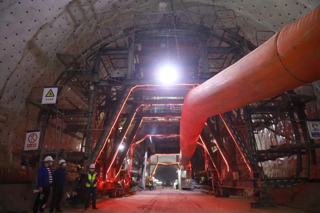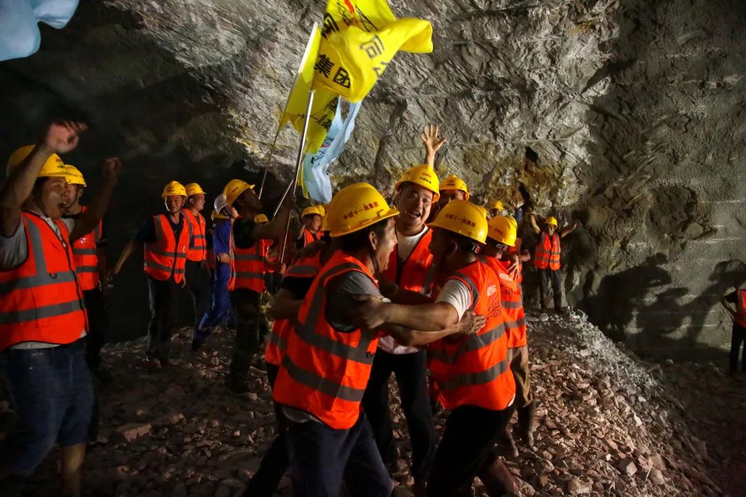 隧道最后一层岩土被成功爆破后分别在隧道进出口两端的施工人员顺利会师