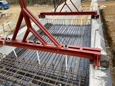 该吊架车轮位置可根据涵洞的宽度进行横向调节,可在不同宽度的涵台上移动。便捷式移动吊架拼装只需一次,减少过程中的反复拆装,同时该方法拆装过程对各型钢构件损坏较小,可多次重复使用,减少了钢材施工及周转过程中的损耗,提高了钢材利用率,节能环保效益显著。