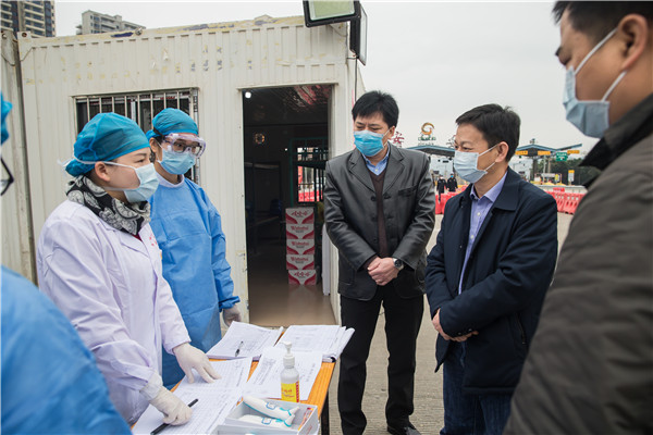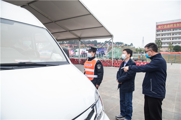 王劼耘在南宁安吉高速公路收费站,向现场的卫生健康部门人员了解防疫一线工作情况。