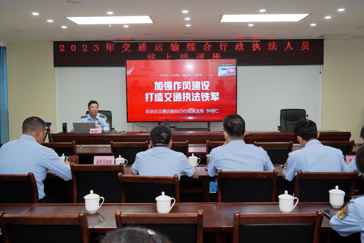 开展执法培训,提升执法规范。自治区交通运输综合行政执法局结合执法队伍素质能力三年提升专项行动,通过年内开设多期交通运输执法人员培训班,从工程建设、公路、港航、道路运输等多个专业执法类型着手,分阶段、分步骤对执法人员进行专业知识和执法培训,不断将严格规范公正文明执法融入执法工作全过程。同时开展执法队伍军事化训练,重点练习立正、稍息、跨立、停止间转法、齐步走等军事项目,进一步提升全区交通运输执法队伍整体素质和执法规范性,树立交通运输执法队伍良好形象。