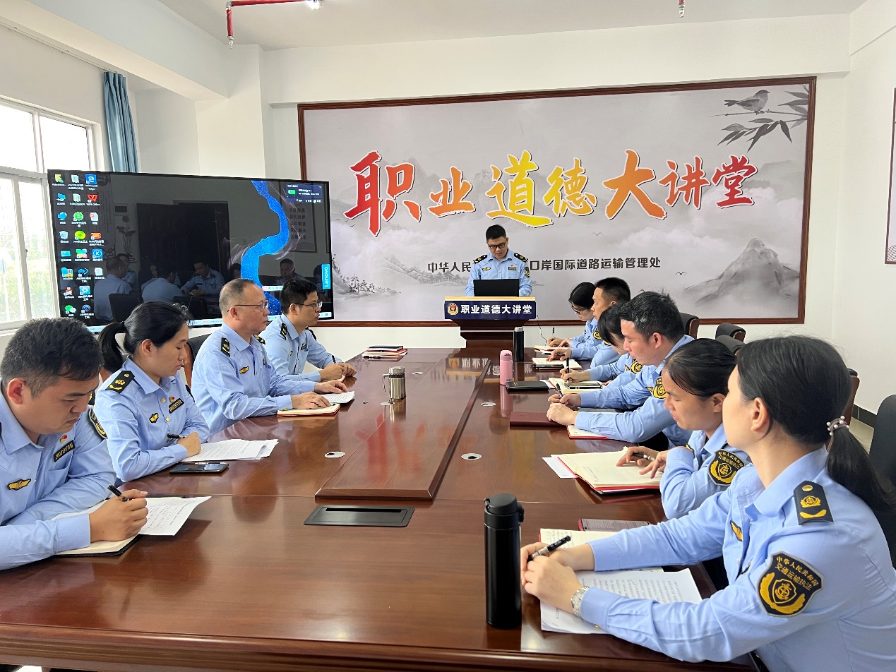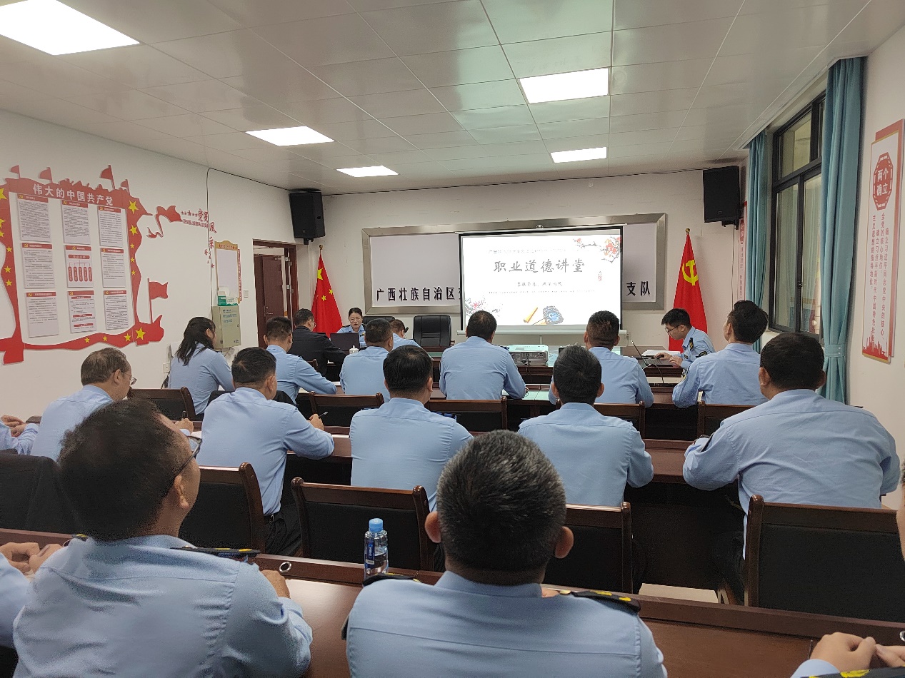 开展道德讲堂,推动职业建设。为有效推动交通运输执法职业道德建设,牢固树立爱岗敬业、忠于职守、秉公执法、廉洁自律的职业道德精神,自治区交通运输综合行政执法部门通过大力开展职业道德大讲堂活动,不断推动以人民为中心的发展思想在交通运输执法领域落地生根。自治区交通运输综合行政执法局第五支队、东兴口岸运管处近期先后举办职业道德大讲堂活动,围绕执法为民主题,树牢交通运输执法队伍执法为民情怀,以提高职业道德操守,强化为民举措、规范执法活动,提升群众满意度为目标,将职业道德建设和执法为民理念有机融合,将严格规范公正文明执法和群众满意度相结合,确保以人民为中心的发展思想在交通运输执法领域行稳致远。