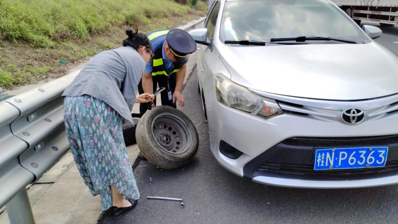 第九支队执法人员为事故群众迅速更换车胎 谭丰琪 摄