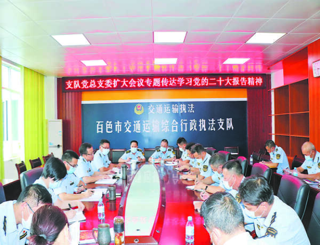 党的二十大召开以来,百色市交通运输综合行政执法支队将学习宣传贯彻党的二十大精神与实际工作相结合,通过线上线下联动学习、专题会议学习等多种形式,组织支队全体人员深入学习宣传贯彻党的二十大精神。