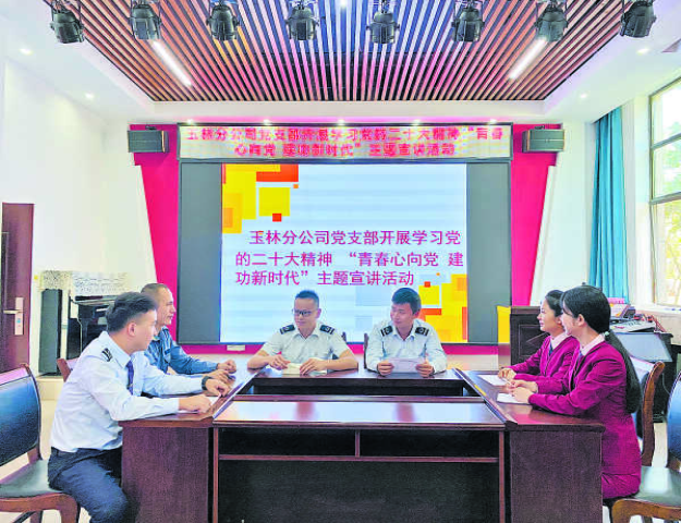 10月20日,广西交通投资集团玉林高速公路运营有限公司玉林分公司党支部组织党员、团员青年开展“青春心向党 建功新时代”主题宣讲活动,学习宣传贯彻党的二十大精神。