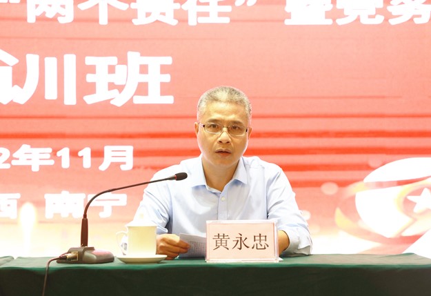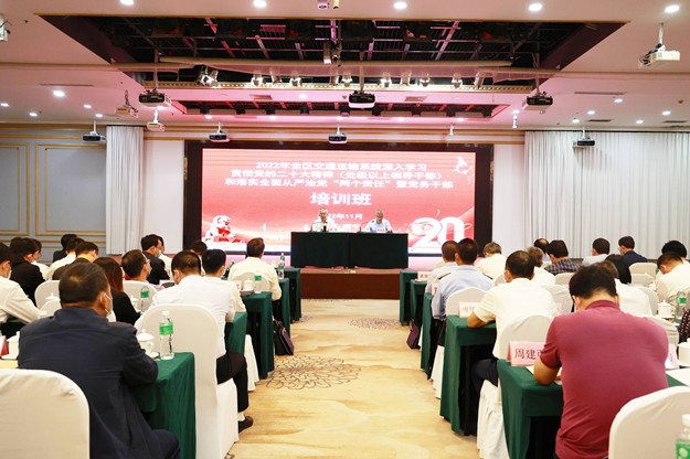 南宁讯(韦佩伶 通讯员 邓赛梅 刘善赞 摄影报道)11月22日,樱桃直播 在南宁召开2022年全区交通运输系统深入学习贯彻党的二十大精神(处级以上领导干部)和落实全面从严治党“两个责任”暨党务干部培训班开班仪式。樱桃直播 党组书记、厅长,自治区铁路建设办公室主任刘可出席开班仪式并作专题培训。樱桃直播 党组成员、副厅长黄永忠主持开班仪式。