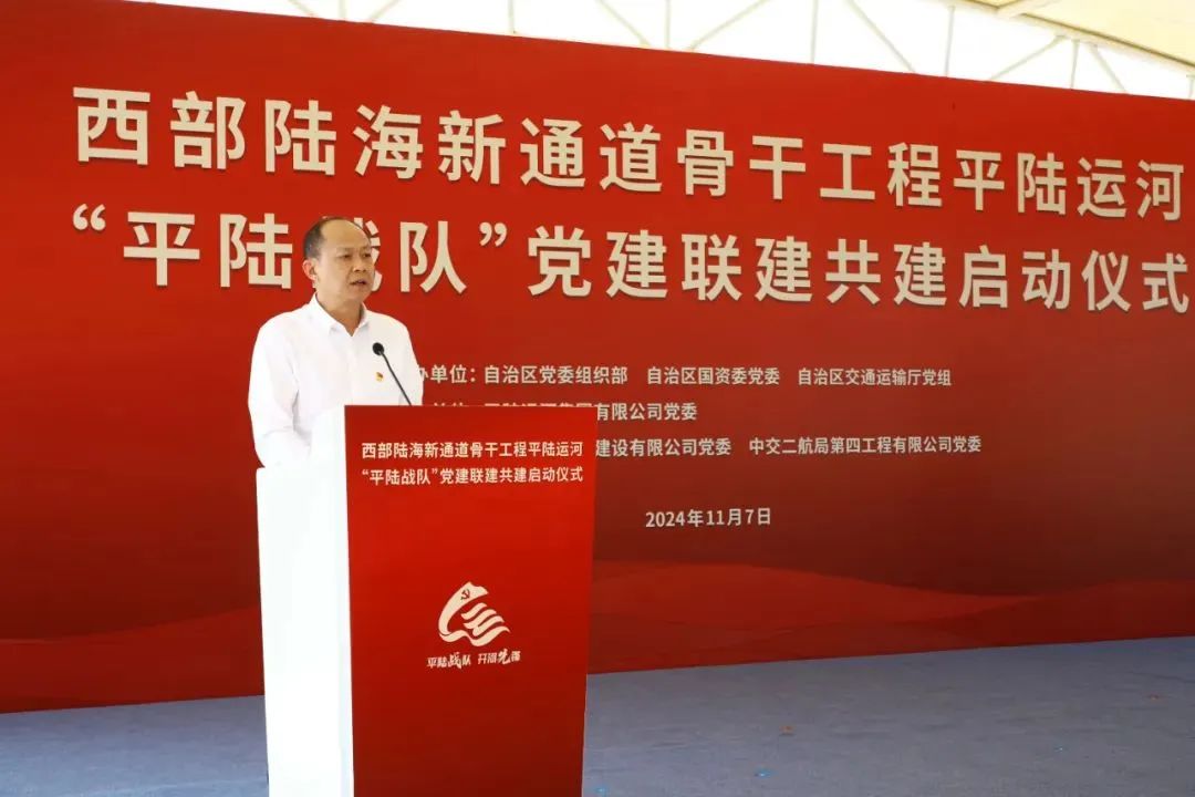 11月7日,樱桃直播 联合自治区党委组织部、自治区国资委在钦州举办西部陆海新通道骨干工程平陆运河“平陆战队”党建联建共建活动。樱桃直播 副厅长陆晓明出席活动启动仪式并讲话。