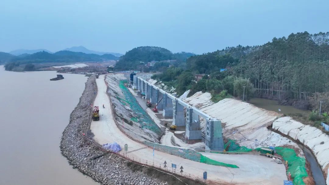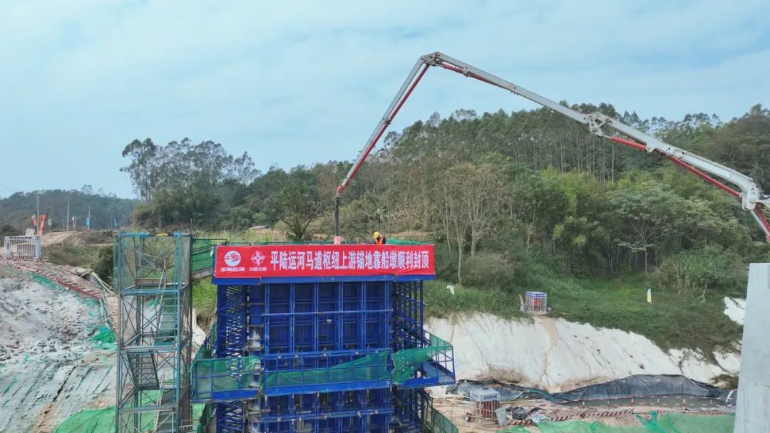 平陆运河马道枢纽船闸上游新福锚地12号靠船墩顺利封顶现场。