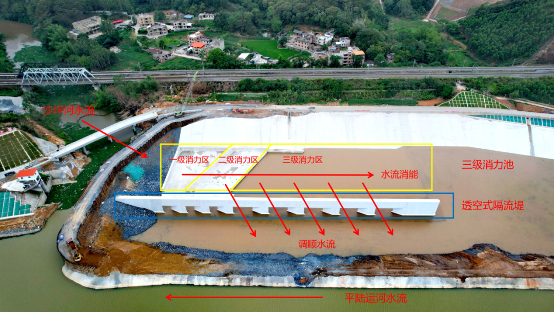 为此,沙坪河支流口工程采取了“隔流堤+消力池+沉沙池”措施,实现“调顺水流+消能+减淤”功能,有效缓解沙坪河水汇入航道时的横向冲击,保证通航后船舶在航道内平稳行驶,并减少航道内泥沙淤积。