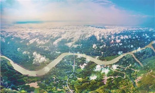 从空中俯瞰,平陆运河连通西江和北部湾,建成后将成为西部陆海新通道上的最美曲线。西南地区货物由此出海,较走广州港缩短内河航程560公里以上,每年带动西部陆海新通道沿线地区节约运输费用52亿元以上。