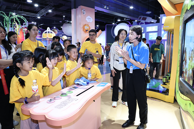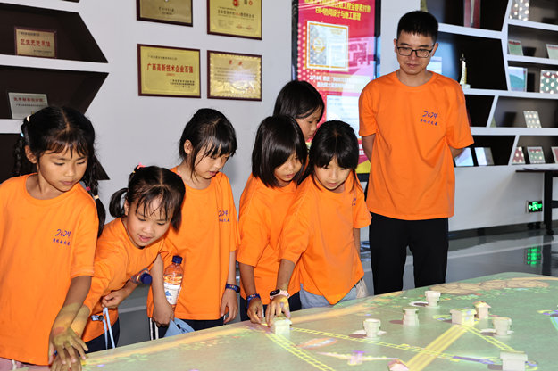 学生们在广西交通设计科普馆体验交通规划桌面投影互动积木。