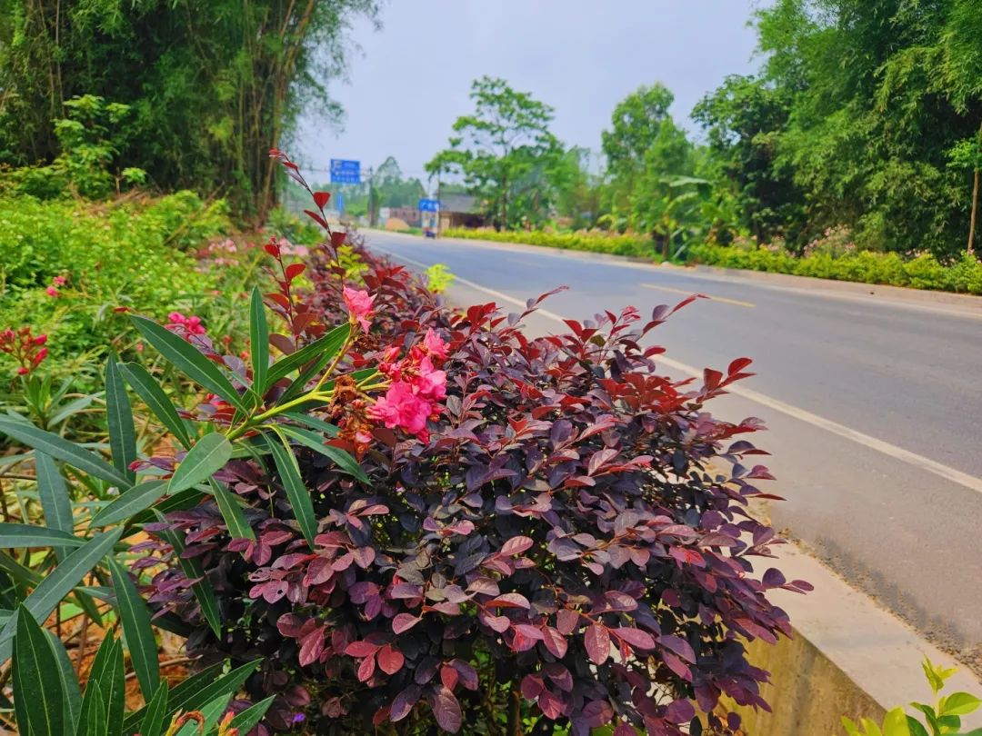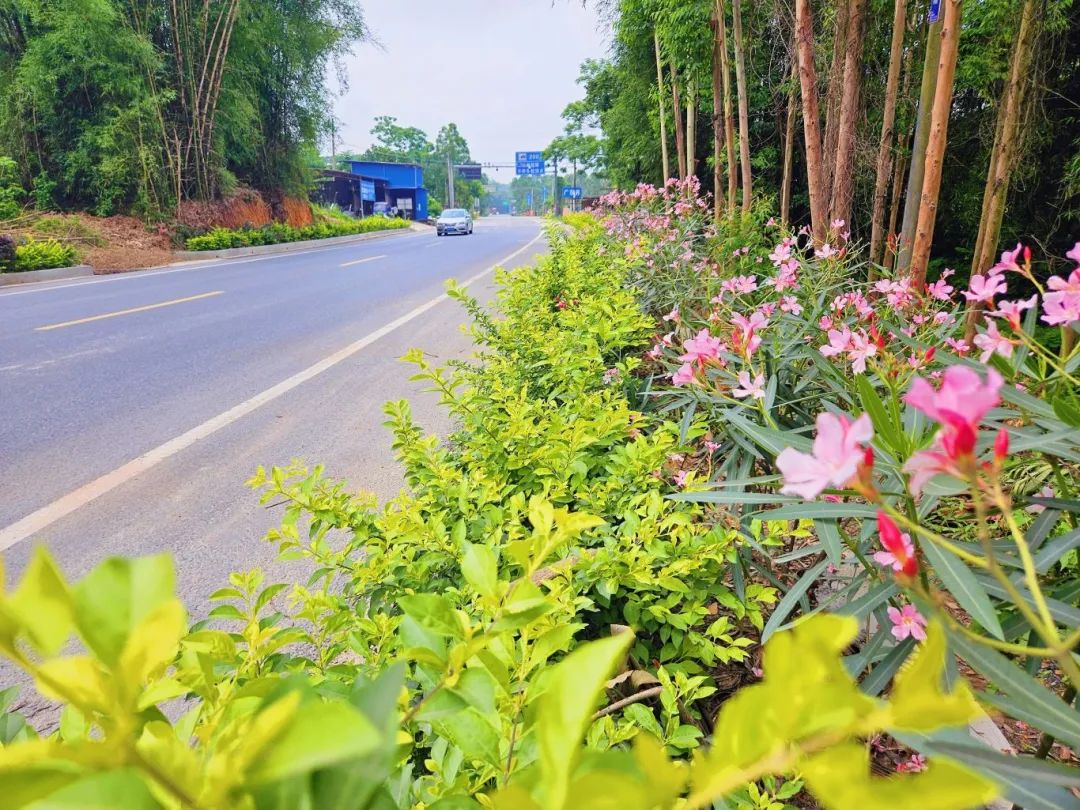 玉林公路发展中心还在该路段实施公路美化绿化提升工程,融合当地浓郁的地域文化,并结合公路特点,在醒目位置布设具有博白区域文化、公路标识的迎客标志性构筑物。同时,充分利用公路沿线设施的空余地带,采用乔、灌、草、花结合的方式,修建公路景观花带,打造“满眼皆有绿、步步皆美景”的公路“生态廊道”。路景融合焕发出的独特趣味与活力,使该路段成为地方形象展示的“公路名片”。