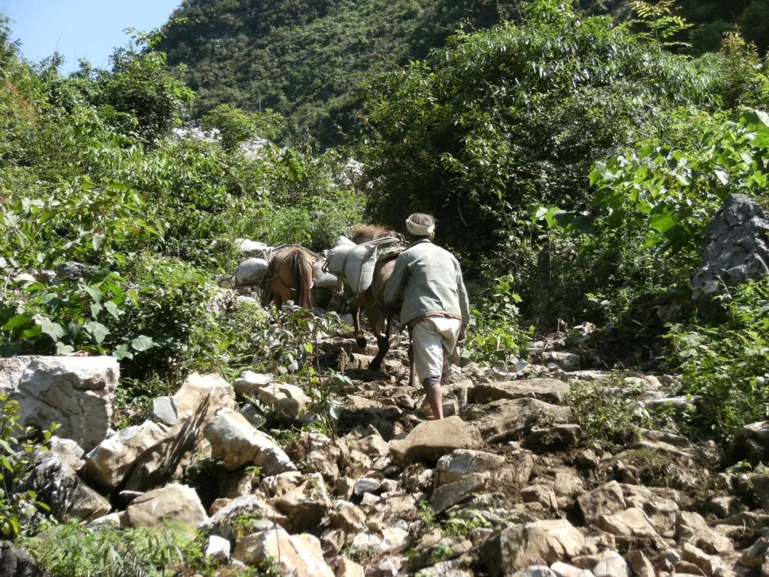 2010年,里湖瑶族乡通屯道路为石头山路,当地群众运送物资只能通过人工或者马驮的方式。(南丹县里湖瑶族乡人民政府 供图)