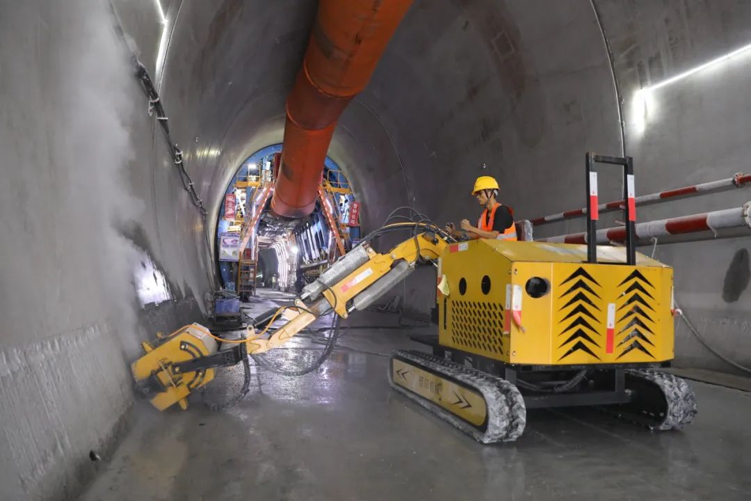 施工人员操作隧道边墙凿毛机对老山隧道进行凿毛作业。(莫小斌 摄)
