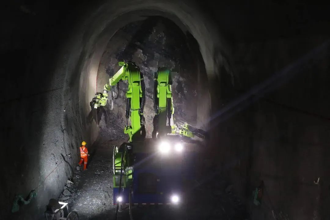 双折叠臂凿岩台车在老山隧道进行掘进作业。(通讯员 莫小斌 摄)