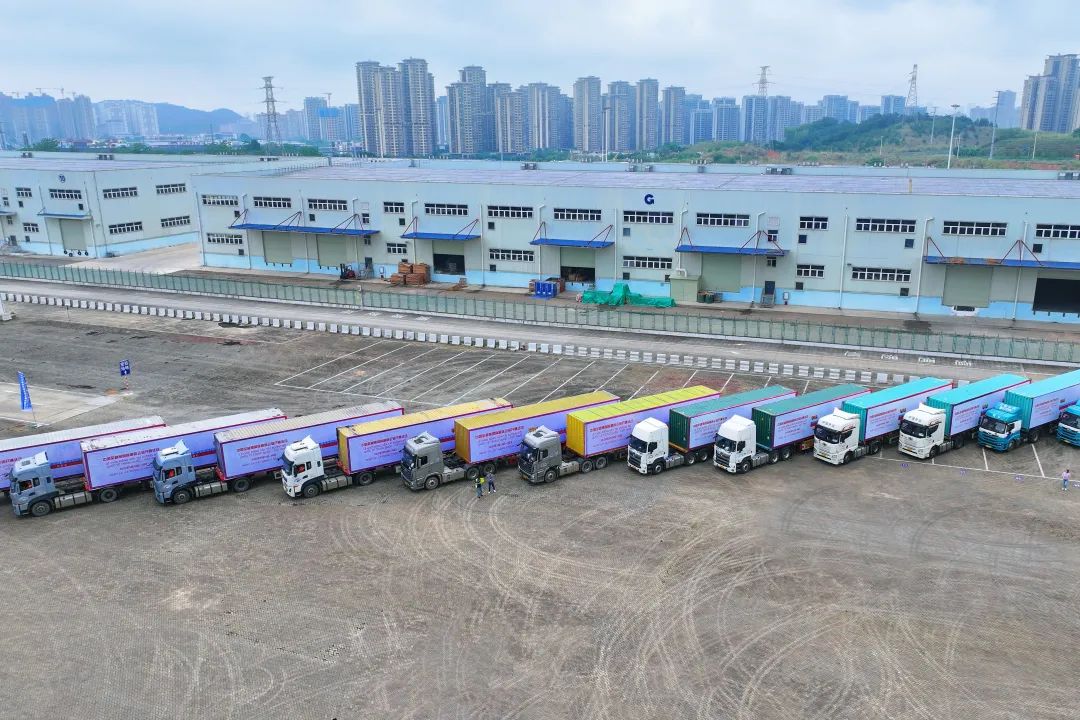 搭载着电子元器件、新鲜蔬菜、百货的运输车队从广西南宁发车。