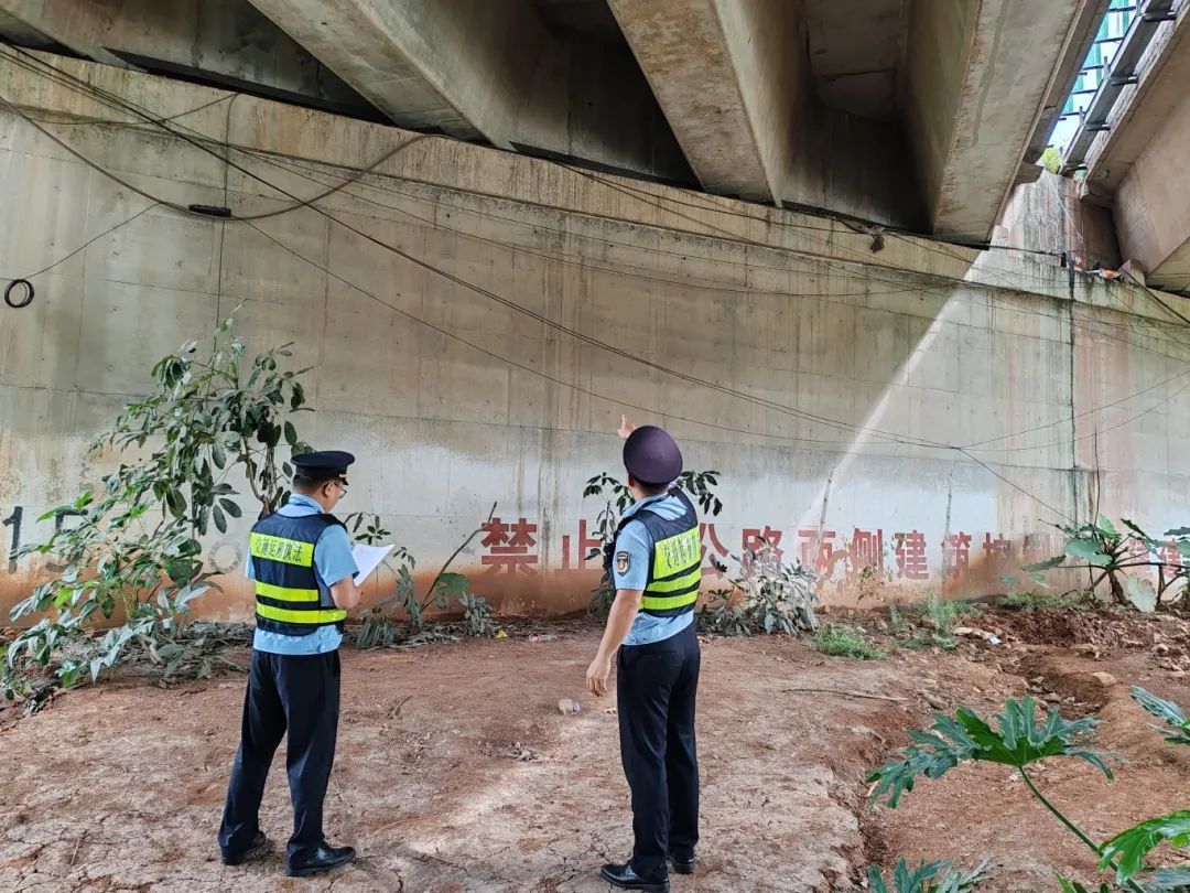 执法人员检查高速公路桥梁安全情况。